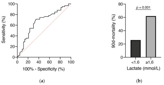 Regarding the initial serum lactate value, the optimal cutoff was 1.6 mmol/L and the AUC was 0.67 (95% CI 0.56–0.78, p = 0.004), with a sensitivity of 67% and a specificity of 71% (Figure 2a). In patients who presented with serum lactate < 1.6 mmol/L, mortality rate after 90 days was 26% (15/57) compared to 62% in patients with an initial serum lactate ≥ 1.6 mmol/L (28/45; p = 0.001, OR 4.6, 95% CI 1.99–10.7, Figure 2b).