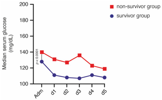 Overall, median admission glucose level was 130 (112–148) mg/dL in all patients. Hyperglycemia was detected on admission in 15 patients (15%). In detail, three patients with deep-seated ICH who survived (5%) compared to 12 patients of the non-survival group (28%) presented with initial hyperglycemia (p = 0.002, OR 7.2, 95% CI 1.9–27.6). Median admission glucose level was 126 (IQR 112–132) mg/dL in the group of patients with deep-seated ICH who survived and 143 (IQR 120–183) mg/dL in the non-survival group (p = 0.001). Patients with deep-seated ICH categorized in the survivor group exhibited a significantly lower median peak lactate value during the study time period (130 mg/dL, IQR 121–144) compared to patients allocated to the non-survivor group (163 mg/dL, IQR 133–213; p < 0.0001). The course of the median glucose values of the initial five days after admission are shown in Figure 3.