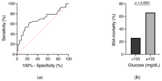 Regarding the initial glucose value, the optimal cutoff was 133 mg/dL and the AUC was 0.69 (95% CI 0.58–0.796, p = 0.001), with a sensitivity of 63% and a specificity of 76% (Figure 4a). In patients who presented with admission glucose < 133 mg/dL, mortality rate after 90 days was 26% (16/61), compared to 66% in patients with an initial glucose ≥ 133 mg/dL (27/41; p < 0.0001, OR 5.4, 95% CI 2.3–12.8; Figure 4b).
