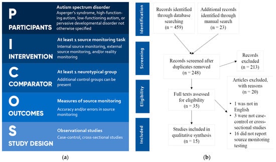 PICOS criteria [] were used for study selection and are reported in Figure 1a. Articles in languages other than English were excluded. A total of 459 articles were retrieved from the database search, and 23 additional articles were found through manual search. After removal of duplicates, 248 articles were evaluated independently by two authors. After screening, 213 articles were removed, and 35 articles were admitted for full-text evaluation. Of these, 1 was excluded, as it was not in English, 3 were excluded, as they were not case-control or cross-sectional studies, and 16 were excluded, as they did not report SM testing and measures. In the end, 15 articles were included for the systematic review. The process of the literature search and screening is reported in the PRISMA flowchart [] in Figure 1b.