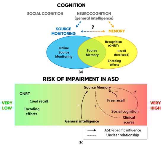 (a) Scheme of the cognitive domains investigated in SM studies in ASD. (b) Degrees to which each domain is impaired in ASD and hypotheses on ASD-specific influences that each function may exert on SM according to the collected findings.