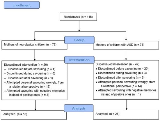 Over the span of two years, 72 mothers of neurotypical children and over the span of three years, 73 mothers of children diagnosed with ASD participated in this study. There was a high rate of attrition among eligible participants, especially among mothers of children with ASD. Out of which, 52 mothers of neurotypical children completed the entire study (73.61% completion rate), while 26 mothers of children with ASD completed the study (35.62% completion rate). Mothers of children in both groups who included relations of others in their personal savouring were excluded from this analysis. The eventual sample in each group consisted of 52 mothers of neurotypical children and 26 mothers of children with ASD (N = 78). The reasons for removal of incomplete data have been reported in the CONSORT flow chart in Figure 1. In the ASD group, 26 mothers between the ages of 26 to 47 (M = 35.73, SD = 4.84) of children who have been diagnosed with ASD between the ages of 3 to 7 (M = 5.44, SD = 1.19) were in this group. The control group consisted of 52 mothers between the ages of 22 years to 44 years old (M = 35.12, SD = 4.34) of neurotypical children between the ages of 3 to 6 (M = 4.10, SD = 1.19).