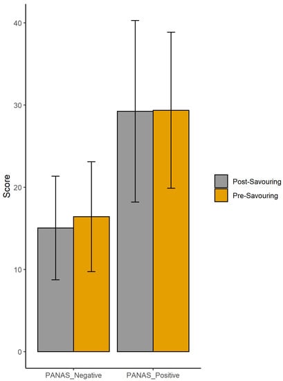 Bar plot of PANAS-Negative and PANAS-Positive pre- and post- savouring.