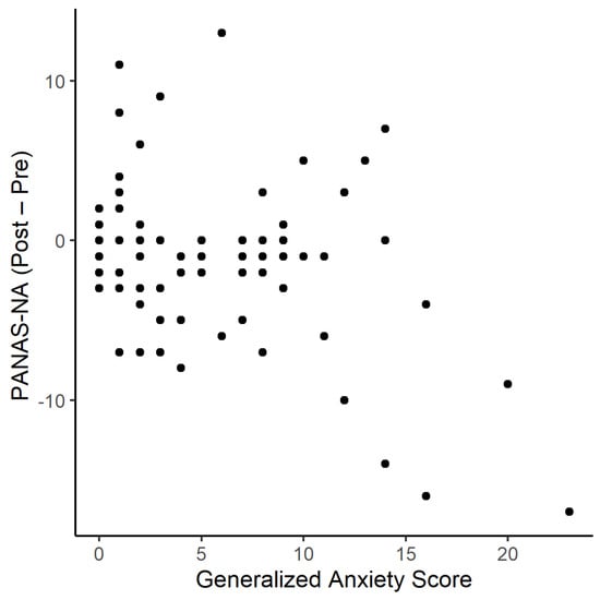 Scatter plot of Generalized Anxiety score against PANAS-NAΔ(Post−Pre).