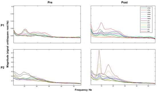 Power spectrum density plots for both participants, pre- and post-MST. (P1: Participant 1, P2: Participant 2, L: left, R: right, Pre: pre-training; Post: post-training, M1: primary motor cortex, AC: auditory cortex, SMA: supplementary motor area: PMv: premotor ventral area, PMd: premotor dorsal area, IFG: inferior frontal gyrus).