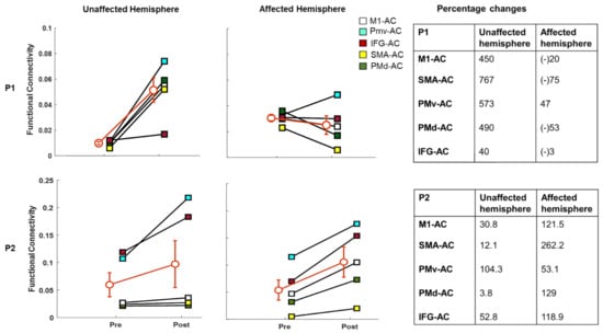 Intracortical coherence in the α-band in Participant 1 and Participant 2, with percentage connectivity changes before and after MST. The error bars (i.e., orange line) represents the standard error of the mean in the overall functional connectivity. (M1: primary motor cortex, AC: auditory cortex, SMA: supplementary motor area: PMv: premotor ventral area, PMd: premotor dorsal area, IFG: inferior frontal gyrus, P1: Participant 1, P2: Participant 2).