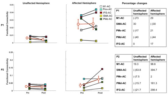 Intracortical coherence in the β-band in Participant 1 and Participant 2 with percentage connectivity changes before and after MST. The error bars (i.e., orange line) represent the standard error of the mean in the overall connectivity. (M1: primary motor cortex, AC: auditory cortex, SMA: supplementary motor area: PMv: premotor ventral area, PMd: premotor dorsal area, IFG: inferior frontal gyrus, P1: Participant 1, P2: Participant 2).