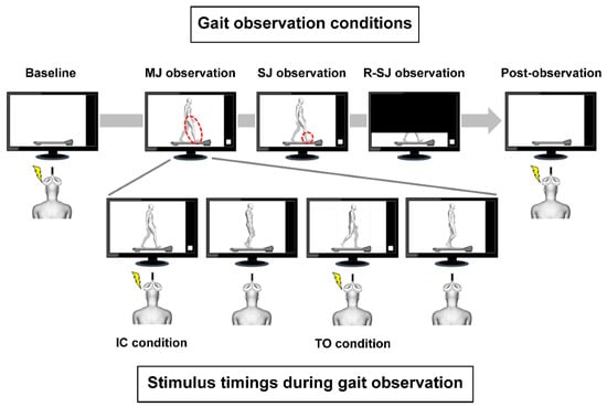 While brain imaging can identify the activation of motor cortical areas in response to movement observation, single-pulse TMS can also reveal the cortical motor resonance to the observed movement. Motor-evoked potentials (MEPs) induced by TMS during action observation are reported to be closely coupled to the muscles involved in the action execution [12,13,14,15,16,17,18,19,20,21,22] and the temporal pattern of the observed action [14,15,22,23,24], which are remarkable and meaningful findings elucidated by TMS studies. Regarding the motor system activity during mere cyclic gait observation, prior TMS studies have demonstrated that the motor resonance to the observed whole-body gait movement was enhanced in the crural flexor and extensor muscles throughout the step cycle [25,26], which is incompatible with the kinematic feature of actual walking in terms of the time course of muscle activity. Although AOT is often used to improve walking ability in clinical settings [4,7,9], the motor cortical activity while observing human bipedal walking is not well-known; for example, it is unknown whether this curious motor resonance during gait observation replicates the original time course of the motor cortical activity during gait execution, or whether it is interfered with by factors affecting the inner automatic motor response process of the observed gait in a top-down modulation manner [27].