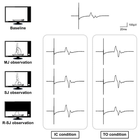 Representative waveforms of the averaged motor evoked potentials (MEPs) obtained from a single participant during the baseline, multiple-joint (MJ), single-joint (SJ), and restricted single-joint (R-SJ) observation conditions. The four pictures on the left represent the simplified observation conditions. The MEP on top of the image is the averaged waveform recorded at baseline condition; below, the MEPs presented were recorded at the initial contact (IC) and toe-off (TO) conditions.