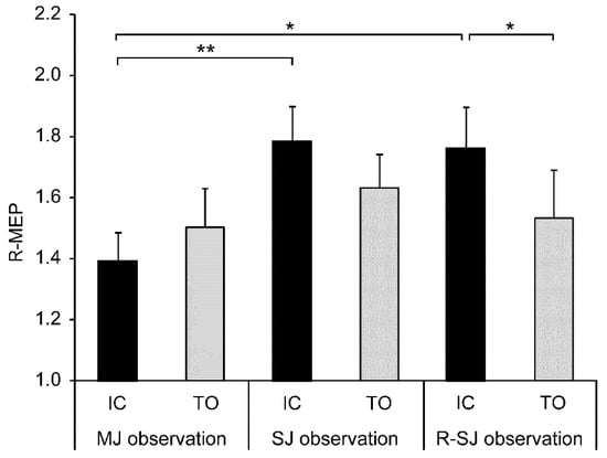 Mean values and standard errors of relative motor evoked potentials (R-MEPs) in two stimulus conditions (IC and TO) during three observation conditions (MJ, SJ, and R-SJ). The MEP values in each condition were divided by the average baseline MEP value and expressed as R-MEP. * p < 0.05; ** p < 0.01. IC, initial contact; TO, toe-off; MJ, multiple-joint; SJ, single-joint; R-SJ, restricted single-joint.