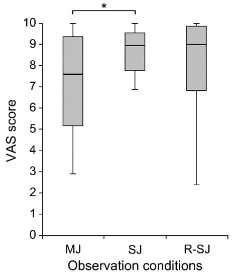 The visual analog scale (VAS) scores evaluating the degree of attention during individual observation conditions (MJ, SJ, and R-SJ) in compliance with the instructions. * p < 0.05. MJ, multiple-joint; SJ, single-joint; R-SJ, restricted single-joint.