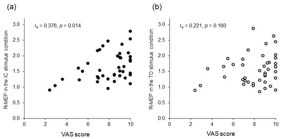 In complementary analyses including the VAS scores, the Friedman test and post hoc multiple comparisons revealed that the VAS score was higher in the SJ than that in the MJ condition (p = 0.008); no significant difference was found among the other conditions (Figure 4). Additionally, Spearman’s test showed a significant positive correlation between excitability changes in the corticospinal tract and the VAS score in the IC stimulus condition (rs = 0.376, p = 0.014), but not in the TO stimulus condition (rs = 0.221, p = 0.160) (Figure 5).