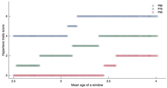 Distribution of the hyperlexic trait score across partially overlapping age windows, each comprising 100 unique visits, according to 90th, 75th and 50th percentile threshold criteria, respectively, represented in blue, green and red.