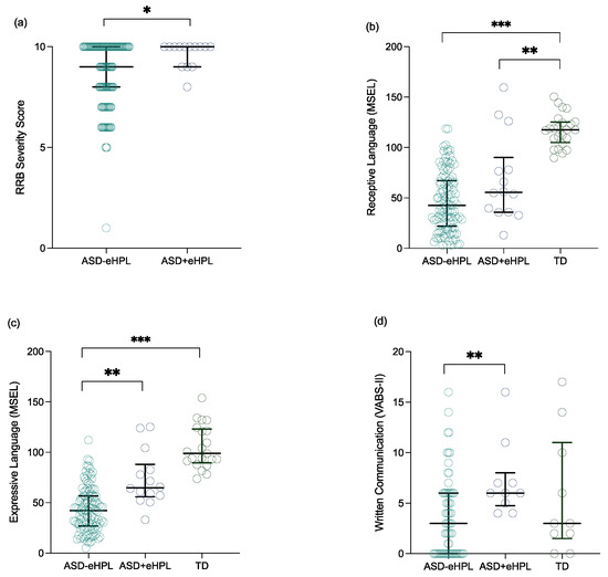 Regarding the VABS-II parents’ reports, children from the ASD+eHPL group showed similar communication skills compared to their ASD-eHPL peers and both were lower than the TD group (UASD-eHPL/ASD+eHPL = −31.418, p = 0.116, r = −0.059; UASD-eHPL/TD = −83.106, p < 0.001, r = −0.578; UASD+eHPL/TD = −51.688, p = 0.009, r = −0.220). More precisely, the ASD+eHPL and ASD-eHPL scores were both lower than the TD group scores concerning both the Receptive (UASD-eHPL/ASD+eHPL = −15.208, p = 0.944, r = −0.075; UASD-eHPL/TD = −80.899, p < 0.001, r = −0.565; UASD+eHPL/TD = −65.691, p < 0.001, r = −0.281) and Expressive (UASD-eHPL/ASD+eHPL = −34.561, p = 0.066, r = −0.170; UASD-eHPL/TD = −89.309, p < 0.001, r = −0.624; UASD+eHPL/TD = −54.748, p = 0.005, r = 0.234) subdomains of the Communication scale and no difference was observed between them. However, we identified a significant difference between the two groups of children with ASD regarding the Written Communication subscale, where children with ASD+eHPL presented higher skills in this area. The written communication skills of the ASD+eHPL group did not differ significantly from those of the TD group, which in turn did not differ from those of the ASD-eHPL group (UASD-eHPL/ASD+eHPL = −23.288, p = 0.014, r = −0.031; UASD-eHPL/TD = −7.638, p = 1.000, r = −0.100; UASD+eHPL/TD = 15.650, p = 0.449, r = 0.156; see Figure 2d). As for the other VABS-II domains, the ASD+eHPL and ASD-eHPL groups showed similar performances to each other but were inferior to TD children regarding their daily living skills (UASD-eHPL/ASD+eHPL = −0.240, p = 1.000, r = −0.001; UASD-eHPL/TD = −75.328, p < 0.001, r = −0.524; UASD+eHPL/TD = −75.088, p < 0.001, r = 0.319), socialization skills (UASD-eHPL/ASD+eHPL = −6.897, p = 1.000, r = −0.034; UASD-eHPL/TD = −87.004, p < 0.001, r = −0.605; UASD+eHPL/TD = −80.107, p < 0.001, r = 0.341) or motor skills (UASD-eHPL/ASD+eHPL = −12.139, p = 1.000, r = −0.059; UASD-eHPL/TD = −52.078, p < 0.001, r = −0.363; UASD+eHPL/TD = −39.939, p = 0.066, r = 0.170).