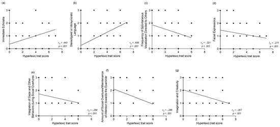 Correlations between the hyperlexic trait score and raw scores on individual ADOS items at baseline for the entire ASD group (comprising ASD+eHPL and ASD-eHPL groups). (a) Correlation between the hyperlexic trait score and immediate echolalia. (b) Correlation between the hyperlexic trait score and stereotyped or idiosyncratic language. (c) Correlation between the hyperlexic trait score and the frequency of spontaneous vocalization directed to others. (d) Correlation between the hyperlexic trait score and facial expressions. (e) Correlation between the hyperlexic trait score and integration of gaze and other behaviors during social overtures. (f) Correlation between the hyperlexic trait score and amount of social overtures/maintenance of attention towards the examiner. (g) Correlation between the hyperlexic trait score and imagination and creativity.