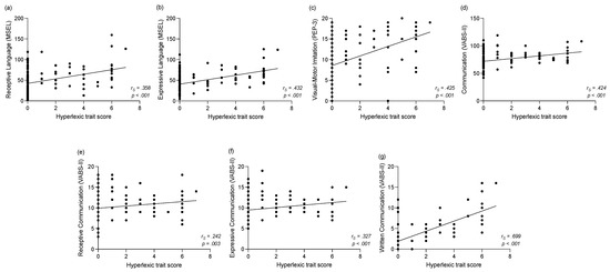 Correlations between the hyperlexic trait score and the developmental and adaptive assessments at baseline for the entire ASD group (comprising ASD+eHPL and ASD-eHPL groups). (a) Correlation between the hyperlexic trait score and receptive language skills (MSEL). (b) Correlation between the hyperlexic trait score and expressive language skills (MSEL). (c) Correlation between the hyperlexic trait score and visual–motor imitation skills (PEP-3). (d) Correlation between the hyperlexic trait score and communication skills (VABS-II). (e) Correlation between the hyperlexic trait score and receptive communication skills (VABS-II). (f) Correlation between the hyperlexic trait score and expressive communication skills (VABS-II). (g) Correlation between the hyperlexic trait score and written communication skills (VABS-II).