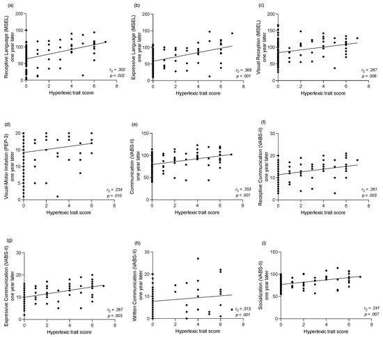 Significant correlations with developmental measures observed at baseline were still significant with measures one year apart. Regarding the MSEL, children with a higher hyperlexic trait score at baseline showed better receptive (rs = 0.302, p = 0.002, see Figure 5a) and expressive (rs = 0.368, p < 0.001, see Figure 5b) language skills one year later. Moreover, a higher hyperlexic trait score at baseline was also correlated with higher visual reception abilities one year later (rs = 0.267, p = 0.006, see Figure 5d) but not with motor skills (rs = 0.181, p = 0.064). Furthermore, a higher hyperlexic trait score at baseline was correlated to better visual–motor imitation skills (rs = 0.234, p = 0.010; see Figure 5c) in the PEP-3 one year later.