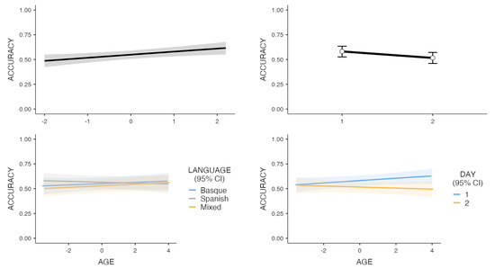 The simplest resulting model with the highest capacity to explain the accuracy data (n = 25,020 observations) included a fixed structure consisting of the factors Language, Day, Age, and Level of Basque, and the two-way interactions between Day and Age, and between Language and Age. This model was then analyzed in Jamovi [66] using the GAMLj module [67] (see Figure 2 for a graphical representation of the results). The main effect of Level of Basque was found to be significant (χ2(1) = 6.996, p = 0.008), with accuracy increasing as a function of the self-reported Basque proficiency level. The main effect of Day closely approached significance (χ2(1) = 3.368, p = 0.066), suggesting a drop in accuracy as a function of delayed testing. The rest of the main effects were negligible (all ps > 0.60). Importantly, the two interactions were significant. First, the interaction between Day and Age (χ2(1) = 21.598, p < 0.001) showed that accuracy increased with age on the immediate recall and recognition tests (Day 1), while it remained constant across ages on delayed tests (Day 2). Second, the interaction between Age and Language (χ2(2) = 8.869, p = 0.012) showed that, while performance was highly similar for Basque and Mixed conditions across ages (z = 1.169 and z = 1.795, respectively), older participants showed a drop in accuracy in the Spanish language context (z = 2.957). We interpret this finding as a consequence of the greater training in (or increased exposure to) language switching of older participants. Importantly, the simple tests between the different language contexts in the different age levels did not result as significant (all z < 1.1), suggesting that while the performance with the information processed only in Spanish varied with age, this did not yield differences between the language contexts.