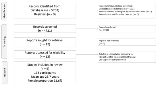 Across the 6 eligible RCTs, a total of 198 participants with a mean age of 23.7 years (range 21.6–25.7) and a female proportion of 62.6% (range 46.7–72.7) were included. Among these six eligible RCTs, three investigated the efficacy of anodal tDCS over dominant primary motor cortex/cathodal tDCS over contralateral hemisphere surrounding F3/F4 for 20 min [9,10,21], one investigated the efficacy of cathodal tDCS over right primary motor cortex (M1) stimulation and anode over left primary motor cortex (M1) [22], one investigated the efficacy of tDCS without detailed information about the specific polarity over prefrontal cortex stimulation [37], one investigated anodal tDCS over left dorsolateral prefrontal cortex (DLPFC) (F3) and cathodal tDCS over right DLPFC (F4) [38], and one investigated the efficacy of tDCS over supplementary motor area stimulation (the anode over Cz and the cathode over Fpz) [22]. All the tDCS stimulation had been applied during their initial training session. The current intensity and stimulation duration in each session ranged between 1–2 mA and 15–20 min. There were not any RCTs investigating the efficacy of other non-invasive brain stimulation on surgical skill training program. All the included RCTs were double-blind design and applied a simulation training program as their tool for surgical skill training. The target surgical skill to acquire/train across the included RCTs included knot-tying or suturing task, fundamentals of laparoscopic surgery, peg transfer tasks, and ultrasonic aspiration of virtual tumors (Table 1). The investigated surgical skill performance was rated by pattern-cutting scores, percent of changes in the amount of tumor resected, knot tensile strength, and overall performance score. Because most included RCTs provided results for “immediately after completion of training” but not results for “at follow-up after completion of training”, we chose to extract the data for “immediately after completion of training”.