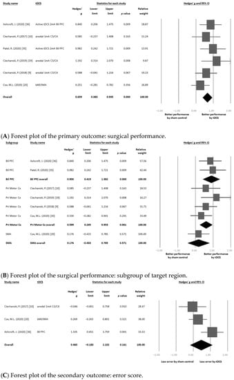 Transcranial direct-current stimulation (tDCS) may improve both the executive function and motor-learning function in healthy volunteer through brain function modulation [12], which two functions were the key components in surgical skill acquisition/training. The potential beneficial effect on executive function might be derived from its enhancing effect on long-term potentiation and brain-derived neurotrophic factor expression in the stimulated brain regions [13]. The motor function improving effect might be contributed by increasing or decreasing neuronal activity based on stimulation polarity and its current intensity [14,15,16,17]. For example, the previous articles had summarized the evidence of tDCS efficacy in motor skill training (either in fine movement or reaction time) in stroke patients and healthy subjects [18,19]. To be specific, Karok and the colleagues had demonstrated different electrode montage-dependent improvement in three experimental tasks (i.e., Purdue Pegboard test, visuomotor grip force tracking task, and visuomotor wrist rotation speed control task) by tDCS application in healthy young adults [20]. Previous randomized controlled trials (RCTs) have found significant beneficial effects in surgical performance during surgical training [10,21]. However, these beneficial effects were not consistent among the different surgical training programs [9]. In addition, differences in the targeted cortex result in different results (i.e., targeted at the primary motor cortex vs. at the supplementary motor area) [22]. Furthermore, although many meta-analyses have demonstrated the benefit of tDCS in the improvement of gross motor activities [23,24], no previous meta-analysis has specifically investigated the benefit of tDCS in surgical skill acquisition, which was recognized to involve complex visuospatial memory, executive function, attention, and fine movement [10].