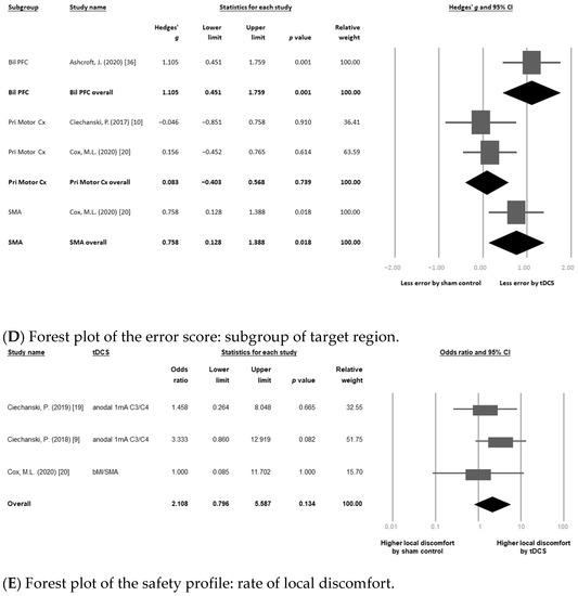 We performed a further subgroup meta-analysis according to the different cortices targeted by tDCS. The subgroup of primary motor cortex (k = 2, Hedges’ g = 0.083, 95%CIs = −0.403 to 0.568, p = 0.739) showed similar results, i.e., that tDCS was not associated with significantly different changes in error scores compared with the sham control. However, there was a significantly better improvement in error score with tDCS over the supplementary motor area (k = 1, Hedges’ g = 0.758, 95%CIs = 0.128 to 1.388, p = 0.018) or over bilateral prefrontal cortex (k = 1, Hedges’ g = 1.105, 95%CIs = 0.451 to 1.759, p = 0.001) than with the sham control (Figure 2D). There was a significant difference between the ESs of these two subgroups according to the interaction test (p = 0.034).