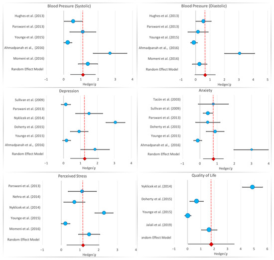 Six studies are reported in the review but were removed in the meta-analysis due to exclusion criteria. One study with teenage participants (mean age = 14.5) [21] was excluded because the participant age was too different than the others. Another was a 12-month follow-up [22] of an already included study [17], 2 studies were a single section mindfulness experimental study to measure instant hearth measure changes [23,24], and 2 studies used outcome measures taken by less than 2 other studies [25]. The 11 studies selected for meta-analysis reported 18 different constructs, but only 6 were reported in 3 or more studies. Selected constructs were anxiety, depression, perceived stress, quality of life, and measured blood pressure (diastolic and systolic). Each outcome was measured by 4 to 7 studies. The p-value was set to 0.009 (Table 3).