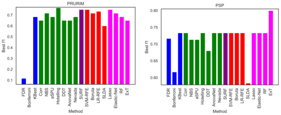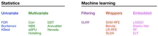 Feature selection is an active field of research within the machine learning community, and as such a large number of algorithms and methods have been proposed. While in principle all of them could be applied to functional brain networks, a complete review goes beyond the scope of this contribution—review that the interested reader can find, for instance, in [41,42]. Here, nine of the most representative and well-known methods are instead discussed and evaluated. For the sake of clarity, there are further divided into three families, following the customary classification in machine learning: filtering, wrapper and embedded methods [41].
