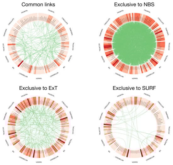 The first step of the test involves constructing the difference network , ; each element represents the statistical difference in the connections between nodes i and j, and is defined as the p-value of a between group difference test. Afterwards, the first and second moments of the difference network D are obtained as and , according to which a certain number of random networks are generated using the efficient algorithm proposed in [32]. The random networks are thus matched to the observed difference network, to capture its true topology. Afterwards, an adaptive threshold selection method is applied for thresholding D. In our analysis, we used the empirical difference degree test (eDDT), which uses the empirical critical value for thresholding. The selected threshold is applied to D and the difference adjacency matrix is obtained, where represents the differences in the connection between nodes i and j. Based on A, a difference degree measure is calculated for each node i. is modeled with a binomial distribution , where is the expected probability for each connection of node i to demonstrate between-group differences and it is computed based on the generated random networks. Finally, the statistical significance of the DWEs at each node is assessed. We here propose to create the list of relevant links by selecting those that are connected to a statistically significant difference node.