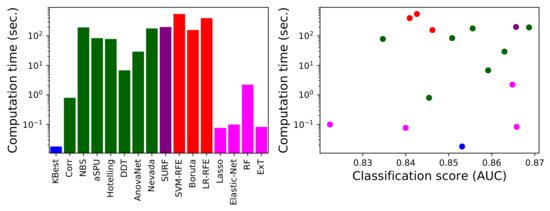 The SURF algorithm [49] builds on top of ReliefF, but, unlike this, eliminates the user parameter k and instead adopts a threshold at a distance T to determine which cases will be considered neighbors. We have used the SURF implementation included in the scikit-rebate package in Python, and available at https://github.com/EpistasisLab/scikit-rebate (accessed on 26 February 2021).