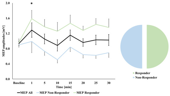 Motor-evoked potential (MEP) curves at baseline and following cTBS 300 stimulation. Time bins are reported in minutes. Black curve: MEP curve of all subjects; green curve: MEP curve of participants showing expected after effects (MEP magnitude increase; shown for a >100% threshold here); blue curve: MEP curve of participants showing unexpected after-effects. * indicates the observed significant effect (LSD test without Bonferroni correction) on the level of all participants. Error bars refer to standard error (SEM).