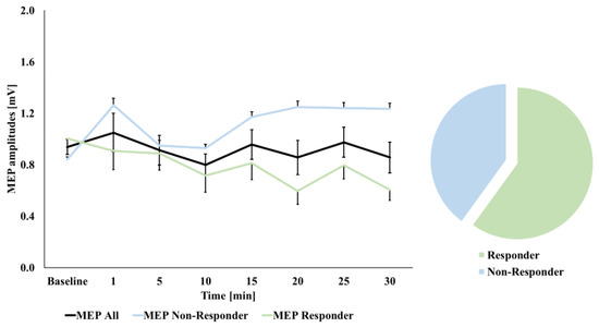 Motor-evoked potential (MEP) curves at baseline and following cTBS 600 stimulation. Time bins are reported in minutes. Black curve: MEP curve of all subjects; green curve: MEP curve of participants showing expected after effects (MEP magnitude decrease; shown for a <100% threshold here); blue curve: MEP curve of participants showing unexpected after-effects. Error bars refer to standard error (SEM).