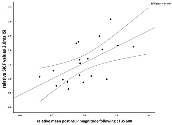 Pearson correlational coefficient between relative mean post MEP magnitudes following cTBS 600 and relative SICF values at ISI 2.0 ms (r = 0.591, p = 0.006) including mean 95% confidence intervals.