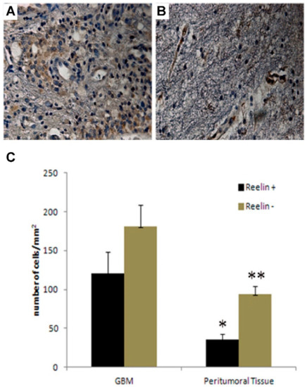 To investigate the expression of reelin, we first performed immunohistochemistry analysis on both GBM and peritumoral tissue specimens. This analysis clearly revealed the presence of a high number of reelin-positive cells in GBM compared to the peritumoral tissue (Figure 1A,B). Moreover, reelin was also found to be expressed at the level of endothelium in both GBM and peritumoral tissue, in agreement with previous findings of reelin expression in brain endothelial cells [48]. Due to the structural complexity of samples studied and to ensure rigorous and unbiased quantitative estimation of data generated by immunohistochemistry, we turned to the stereological analysis [9]. This analysis demonstrated that the cell density (cells/mm2) of reelin (+) cells was significantly (p = 0.015) higher in GBM than in peritumoral tissue (Figure 1C). Our data are consistent with the expression of reelin in both GBM and the corresponding peritumoral area, and with a higher cell density revealed in GBM. These data are in apparent contrast with data published by others that reported a diminished expression of reelin in GBM samples compared to non-pathological samples. We believe that this discrepancy may be due to the extreme heterogeneity of samples employed in the above-mentioned work [49]. Indeed, while our analysis was performed only on grade IV GBM samples, the previous study included primary and secondary glioblastomas and different types of astrocytoma.