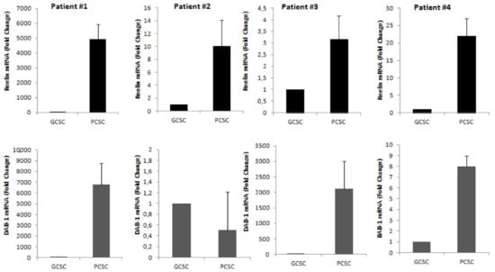 Expression of reelin and Dab1 mRNA by qRT-PCR in GCSCs and PCSCs of four patients. The level of mRNAs of reelin and Dab1 were evaluated by qRT-PCR as described in the Section 2. Upper panels show that mRNA of reelin was higher in all PCSCs compared to GCSCs. Lower panels show that mRNA expression of Dab1 was found higher in three out four examined samples of PCSCs. Bars show the mean of mRNA expression data ± standard deviation from three experiments.