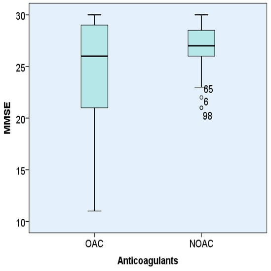 Analysis of the MMSE score in patients with AF and hypertension depending on the type of anticoagulant used (OACs or NOACs). The box represents the interquartile range, the line represents the median value and the bars represent the minimum and maximum values. Points outside the boxplot represent outlier values.
