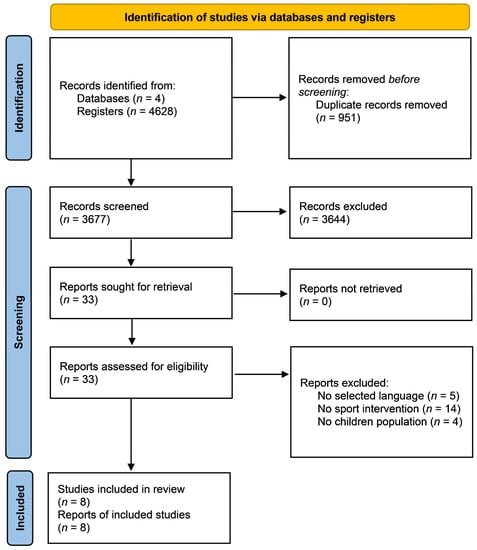 A systematic review was carried out on 1 November 2020 to search the published scientific evidence in order to understand how different sports programs affected executive function in students. The reporting flow diagram of this systematic review was based on the preferred reporting items for systematic reviews and meta-analyses (PRISMA) guidelines [77] (Figure 1).