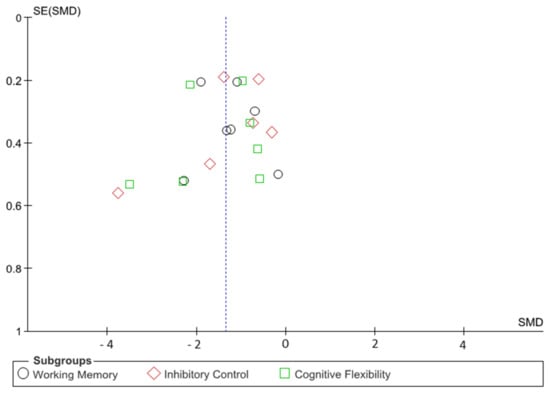 Inhibitory control is the skill of managing attention, behaviour, thoughts, and emotions in order to overcome strong internal bias or distracting external stimuli, enabling us to make the most appropriate response in a specific context [6,101,102]. The results obtained in this meta-analysis showed significant ES inhibition control in healthy children and adolescents (ES −1.30; 95% CI −1.98; −0.63; p < 0.00001). The results of this study stand out from previous studies, which have found small effect sizes for chronic exercise on inhibitory control in this population, such as the meta-analyses by Liu et al. [10] (ES: −0.30); Xue et al. [12] (ES: 0.26) and Álvarez-Bueno et al. [13] (ES: 0.26) among others. These results oppose studies such as De Greeff et al. [9], where no significant effects on inhibitory control were found after the application of physical activity programs in children (ES: 0.19; 95% CI = −0.04, 0.42). This may be because this executive function domain was in the early stages of development at this age [103,104,105].