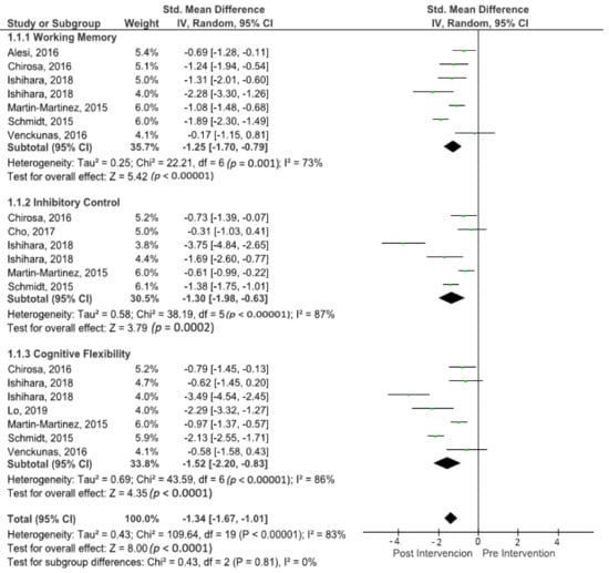 The outcomes for executive function are shown in the forest plot in Figure 3. The difference in executive functions between pre- and post-intervention measurements was assessed via a meta-analysis of all included studies. The three main categories of executive function were separated into different subgroup analyses. Due to potential heterogeneity, a random-effects model was incorporated with I2 and used to assess executive function measures. There was significant heterogeneity detected in all eight studies included in the meta-analysis (I2 = 83%). A large effect was observed when a random-effects analysis was applied for executive function outcomes (ES −1.34; 95% CI −1.67; −1.01; p < 0.00001).