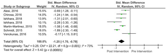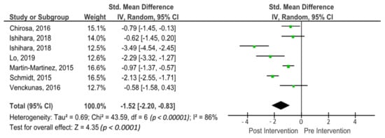 The outcomes for cognitive flexibility are shown in the forest plot in Figure 6. The forest plot contains the SMD and corresponding CIs for cognitive flexibility gain, as well as the overall effect test and heterogeneity analysis of the cognitive flexibility in the experimental groups of the included studies. The pooled mean ES estimating cognitive flexibility comprised seven sports groups from six studies. There was significant heterogeneity detected in this subgroup (I2 = 86%). When a random-effects analysis was applied, a large effect was observed in the post-treatment measurement for cognitive flexibility outcomes (ES −1.52; 95% CI −2.20; −0.83; p < 0.00001).