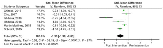 The outcomes for inhibitory control are shown in the forest plot in Figure 5. The forest plot contains the SMD and corresponding CIs for inhibitory control measurements, as well as the overall effect test and the heterogeneity analysis of the inhibitory control in experimental groups of the included studies. The pooled mean ES estimating inhibitory control comprised six sports groups from five studies. There was significant heterogeneity detected in this subgroup (I2 = 87%). When a random-effects analysis was applied, a large effect was observed in the post-treatment measurement for inhibitory control outcomes (ES −1.30; 95% CI −1.98; −0.63; p < 0.00001).