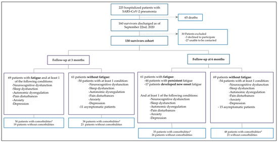Data regarding demographic, clinical characteristics, pre-existing relevant comorbidities considered to confer high risk for severe COVID-19, and laboratory findings were retrieved from the electronic medical records. We excluded the following patients: 1. Those who died before the follow-up started, 2. Those who declined to participate, 3. Those unable to be contacted. The remaining 130 survivors were contacted by phone by trained physicians and were asked to answer a previously designed questionnaire with a checklist of symptoms. Participants were asked a binary question regarding symptoms within six possible ME/CFS domains by organ system, according to the International Consensus Criteria published in 2011 [14]: 1. Fatigue and dyspnea (manifested at rest or post exertional), 2. Neurocognitive and neurosensory dysfunction, (concentration impairment, short-term memory loss), 3. Sleep dysfunction (sleeping disturbances, unrefreshing sleep), 4. Autonomic dysregulation (postural dizziness, lightheadedness, tachycardia, chest pain, temperature intolerance, sweating alterations, gastrointestinal, and genitourinary disturbances), 5. Pain disturbances (headache, joint and muscle pain), and 6. Psychiatric (anxiety, depression), in comparison to their pre-COVID-19 (baseline) status. Any remaining or newly occurring symptoms at 3 and 6 months after discharge from the hospital were recorded. The survivor’s current symptoms were distinguished from those of their pre-COVID-19 acute phase. The course of each symptom during follow-up was documented in detail.