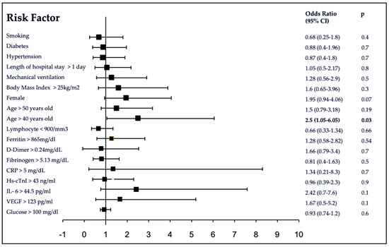 Associated factors in Chronic Fatigue in Post COVID-19. The 95% confidence intervals (CI) of the odds ratios have been adjusted for multiple testing. In bold, independent predictors associated with the outcomes. To the purpose of logistic regression, variables were categorized regarding their 75-percentiles or lowest levels where 25-percentiles were used of our population. C-Reactive Protein (CRP), High sensitive cardiac Troponin I (hs-cTnI), Interleukin-6 (IL-6), Vascular Endothelial Growth Factor (VEGF).