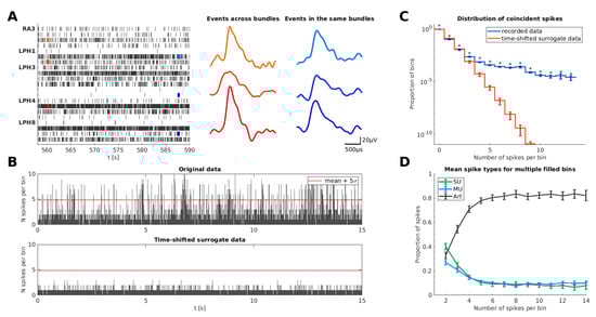 In order to better understand from where the spike events in these bins originate, we manually classified clusters based on our spike-sorting algorithm [] into single units (SU), multi-units (MU), and artifacts (Art) (for details, see Section 2.1.). Figure 1D illustrates the mean proportion of cluster types contributing to the spike events in bins with two or more spikes, averaged across recordings. Time bins with high event counts contain more artifact spikes than bins that are filled with only two simultaneous events. This indicates that spike events occurring simultaneously in numerous channels most likely belong to artifact clusters.