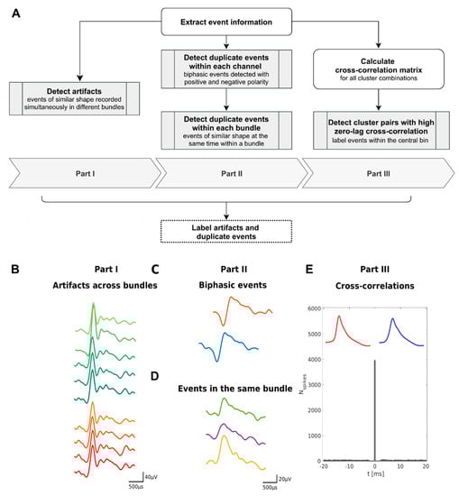 Sources of noise originating from the environment and the clinical setup are often recorded on several bundles simultaneously. As these artifacts can lead to spike events that look very similar to action potentials of neurons (see Figure 1A and Figure 2C), they can be extracted by automatic spike-sorting algorithms but may not be labeled as artifacts. Part I of the DER algorithm identifies these artifacts by detecting spike events of similar shape recorded in different bundles at the same time.