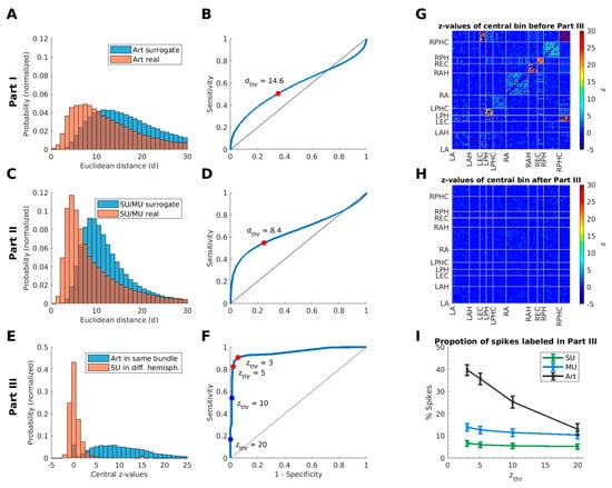 Selection of optimized parameters for the DER algorithm based on the recorded data. (A) Distributions of Euclidean distances between simultaneous artifact-cluster events (red) and between non-simultaneous artifact-cluster events randomly drawn from different hemispheres (blue). These distributions were used to determine the threshold of event shape similarity in Part I of the algorithm. (B) ROC curve for separating the two distributions of the Euclidean distances in Part I. The operating point on the ROC curve (closest point to the upper left corner) defines the threshold of the Euclidean distance (d = 14.6, marked by the red dot). (C) Equivalent distributions for joint single- and multi-unit clusters are plotted to define a threshold of the Euclidean distance used in Part II (detection within the same bundle). (D) The resulting ROC curve yields a threshold of d = 8.4 for Part II (marked by the red dot). (E) Distributions of z-values of the central bin in the cross-correlograms between single-unit clusters from different hemispheres (red) and artifact clusters within the same bundle (blue). The corresponding ROC curve is shown in (F), including operating points for different thresholds of the central z-value of the cross-correlograms. (G) Matrix of central z-values for all cross-correlograms from a recording session with 80 microwires (left (L) or right (R) hemisphere: amygdala (A), anterior hippocampus (AH), entorhinal cortex (EC), posterior hippocampus (PH), parahippocampal cortex (PHC)). Large z-values (red) indicate clusters with a large number of simultaneous spikes; (H) Matrix of central z-values for the same recording after removal of all spike events that were detected in Part III of the algorithm (zthr = 5). Note that isolated z-values above 5 can result from changes in the background distributions of spike counts in the cross-correlograms. (I) Proportion of spikes detected in Part III of the algorithm for different cluster types (SU, MU, and artifacts), averaged across all 51 recording sessions, for different threshold values zthr. Error bars indicate standard error of the mean.