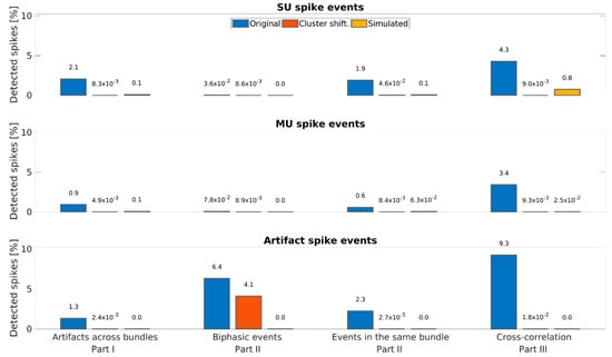 Interestingly, the detection of biphasic spikes within the same channel (Part II—Same channel) deleted 6.46% of all spikes, which were almost exclusively (98.25%) found in artifact clusters, with only 0.55% in SU and 1.20% in multi-unit clusters. This indicates that a high portion of artifacts exhibit a biphasic shape (e.g., a sine-wave-like shape).