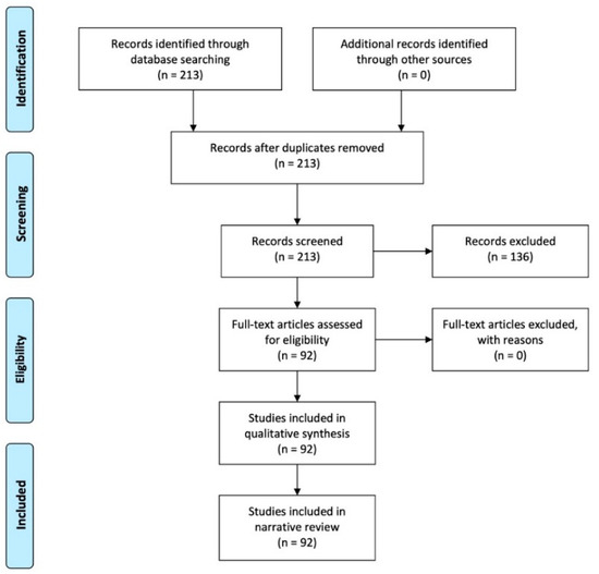 Two-hundred and thirteen articles were identified from the PubMed literature search. These were subsequently screened for relevance: 136 studies were excluded according to the exclusion criteria, while 92 were included. The full text was available for all of the 92 included studies, which were included in the qualitative analysis. Considering the different study techniques, we identified the following: 20 articles relating to neuromelanin, 23 regarding nigrosome-1 imaging, 22 discussing iron imaging, 16 relating to diffusion-weighted imaging, and 11 articles referring to radiomics.
