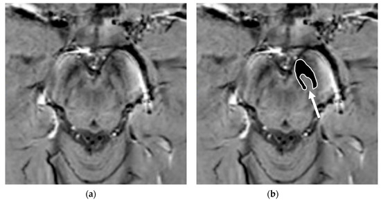 Susceptibility-weighted imaging (SWI) scan performed with a 3T MR scanner in a normally aging brain of a 65-year-old male who underwent a brain MRI examination for persistent headaches. A raw slice passing through the mesencephalon (a) and the same slice with superimposed highlighted SNc (white surrounded black ROI), thereby demonstrating the normal appearance of the nigrosome-1 (hyperintense area pointed by the white arrow) or swallow-tail sign (b).