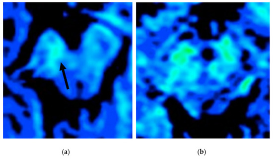 T2* map study (color scale) of two patients with PD in an evaluation of iron deposition within the SN (blue: less iron deposition; green: more iron deposition). The patient in (a) has a more evident asymmetrical iron deposition when compared to the patient in (b).