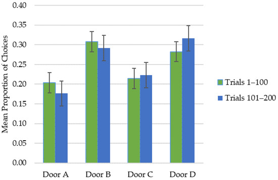 Mean proportion of choices by door for each 100-trial epoch in the whole sample. The differences between Trials 1–100 and Trials 101–200 are at significance p level < 0.001.